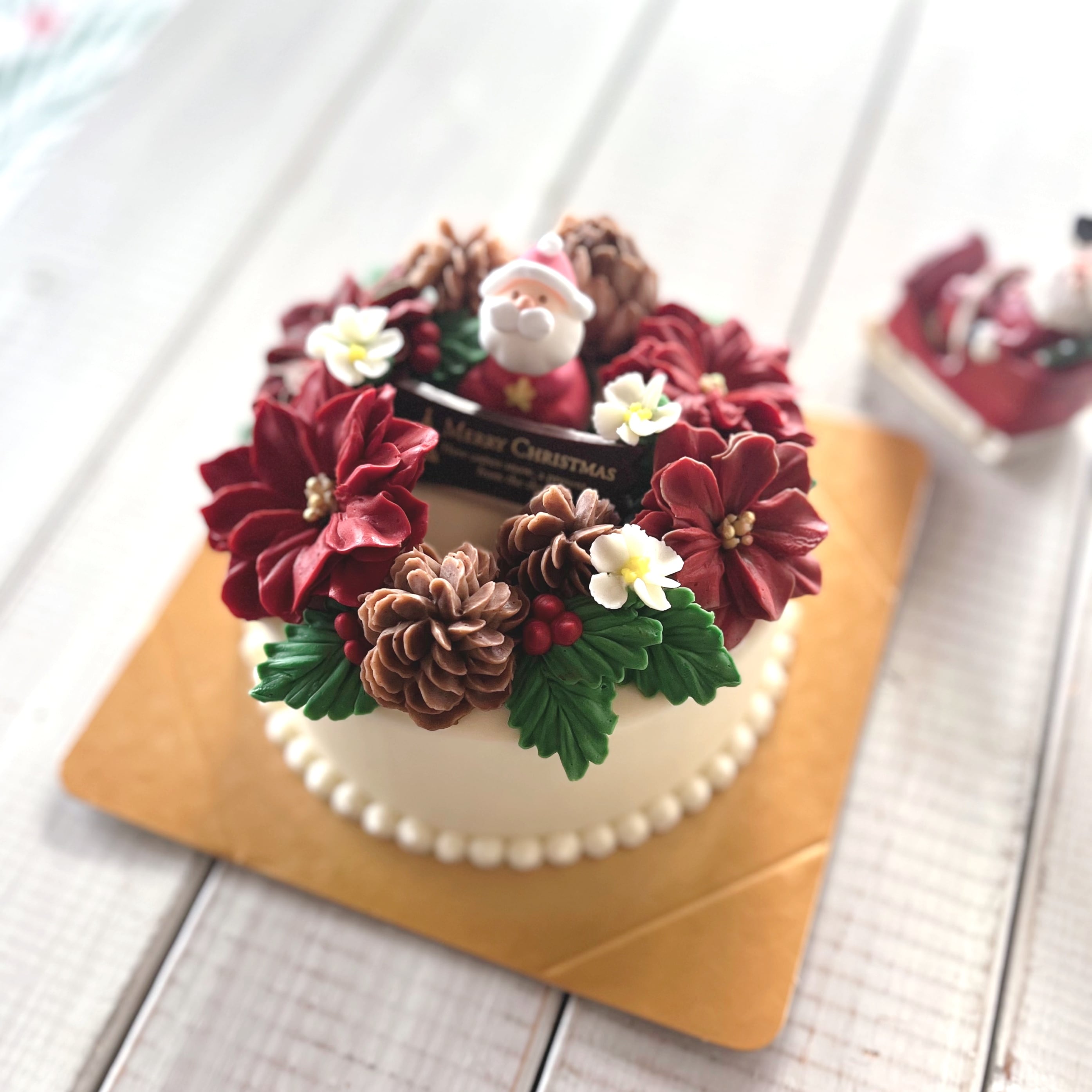 このフラワーケーキのこだわりは、手作り感溢れるデコレーションと、鮮やかな色合いのクリスマスデザインと、上品な香りのバタークリームケーキが絶妙に調和し、心躍るひと時を演出します。