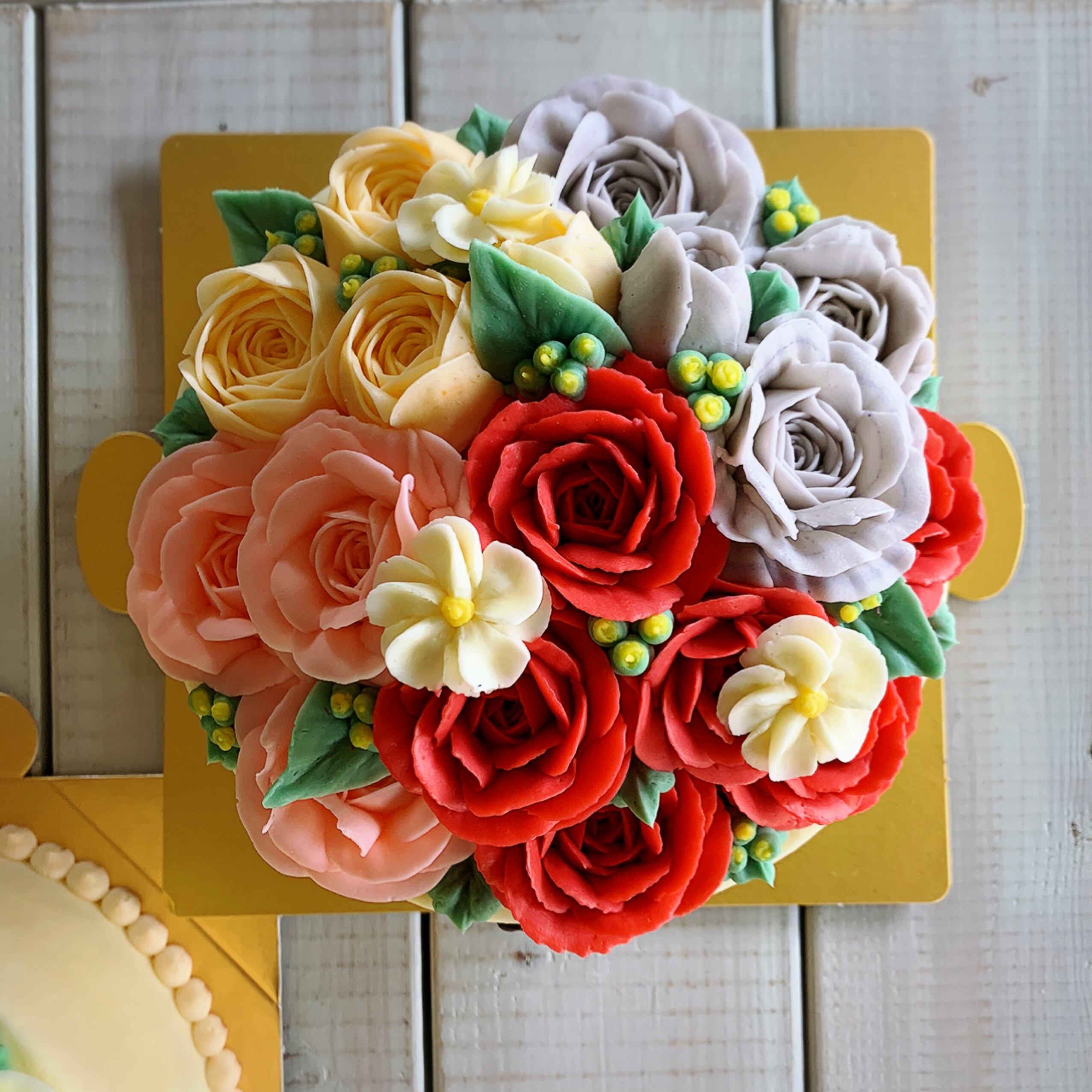 新鮮な卵で作ったスポンジにベリー系のコンフィチュールを三段にサンドして、全て作りたてのバタークリームで、仕上げます。そしてバタークリームで全て手作業で絞ったお花をデコレーションしました。